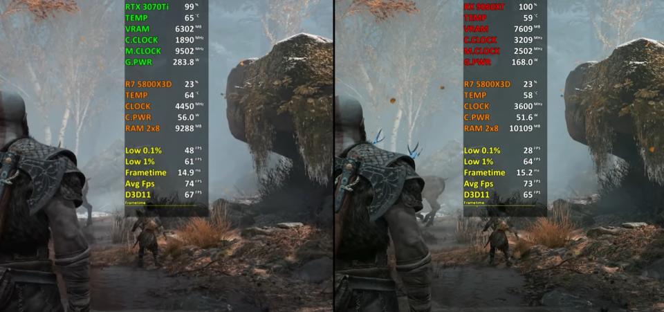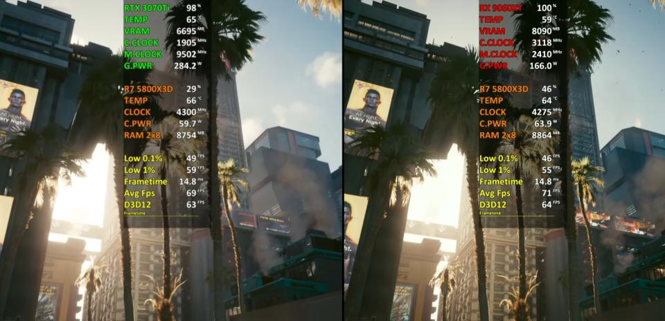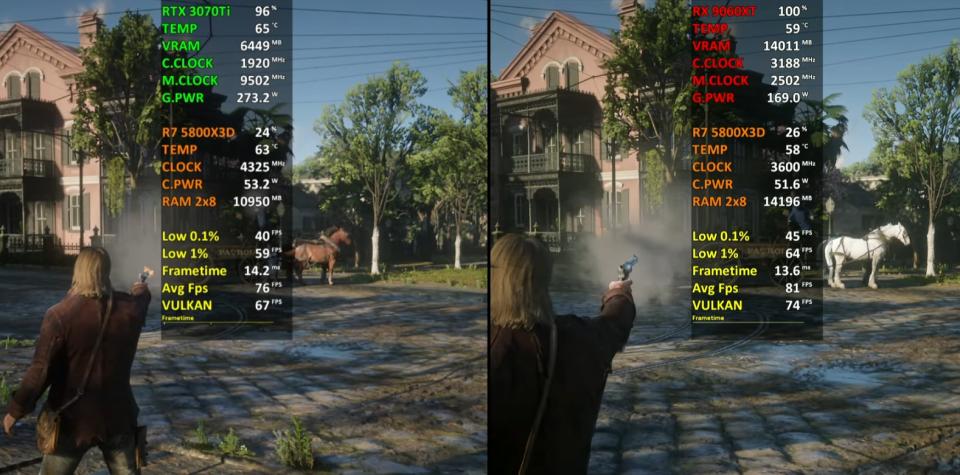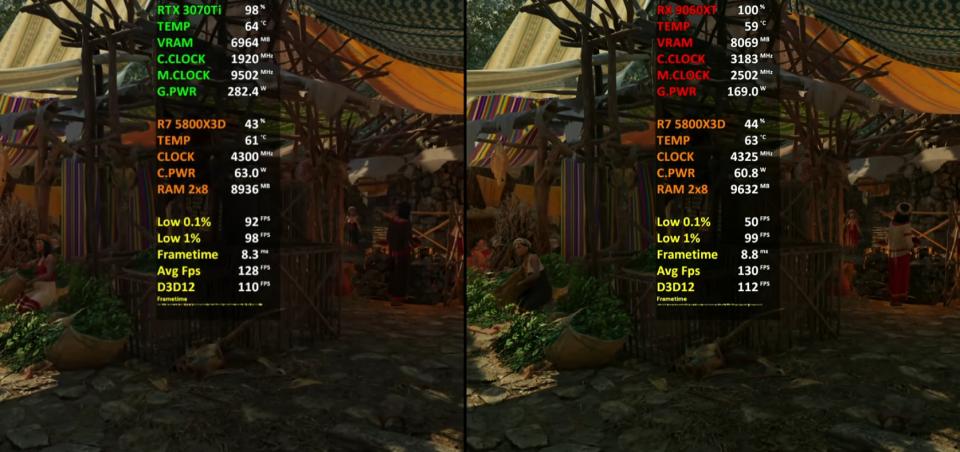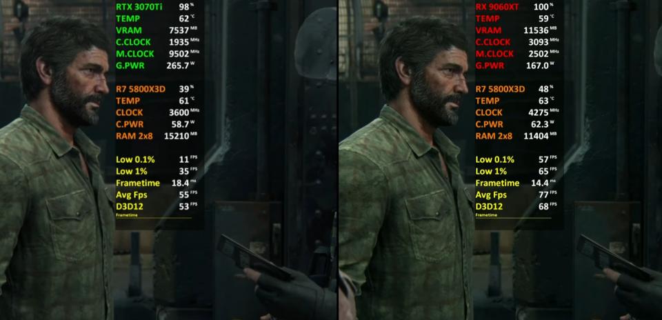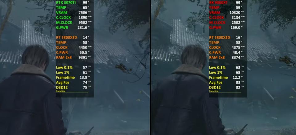 以下将分别测试七款游戏,均采用1440p画质模式,以下系列图片中左边代表geforce rtx 3070 ti 8gb平台,右边代表radeon rx 9060 xt 16gb平台。