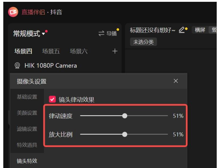 1、打开摄像头设置页面,在镜头特效栏中勾选“镜头律动效果”,即可生效