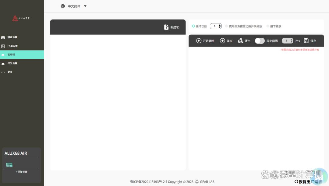 值得一提的是,黑爵alux68 air三模机械键盘还支持定制驱动与网页驱动,从而可以对其按键功能、fn层功能、宏以及背光等功能进行自定义。黑爵alux68 air三模机械键盘的界面比较简单,宏功能界面只需要玩家消除按键延迟,之后按下所需要触发的功能即可,保存之后便可以在按键功能设置界面找到。而在背光界面,除了预设的诸多背光效果之外,黑爵alux68 air三模机械键盘能够自定义每个按键的背光功能,从而打造更个性的键盘风格。