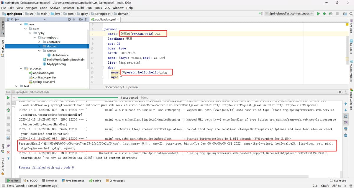 整体核心逻辑:测试类通过 @springboottest 启动 spring 容器,容器加载 @configuration 配置类后,通过 @propertysource 读取自定义配置文件、@importresource 导入 xml 配置并注册 helloservice 类型 bean,spring 自动为该 bean 注入配置文件中的版本属性,最终测试类通过 @autowired 注入 bean 并调用方法验证属性注入效果。