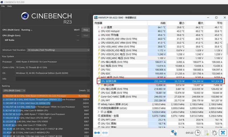 实测环节,选择amd锐龙9 9950x3d处理器、rtx 5090 d显卡进行搭配,考查该主板在搭配旗舰级硬件时的表现。正式测试之前,我们使用furmark cpu对处理器进行了考机。在解锁处理器功耗的情况下,amd锐龙9 9950x3d的实时最高功耗可以达到256w,这个功耗表现甚至超过了部分x870主板。