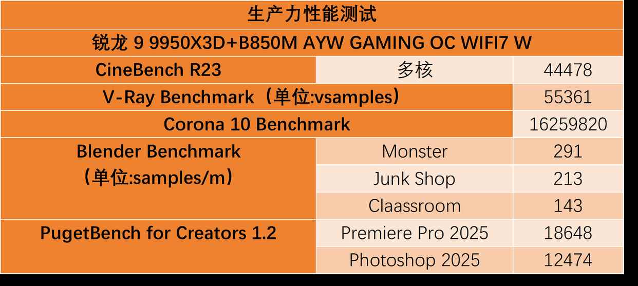 处理器生产力性能测试中,锐龙9 9950x3d处理器在该主板上的表现很不错。cinebench r23成绩达到44478分,也是属于优秀的水平。而在考验多线程性能的3d渲染软件中,锐龙9 9950x3d在几款生产力软件中的成绩也比较出色,说明主板对锐龙9 9950x3d的性能释放十分到位,能够充分发挥旗舰处理器的性能。