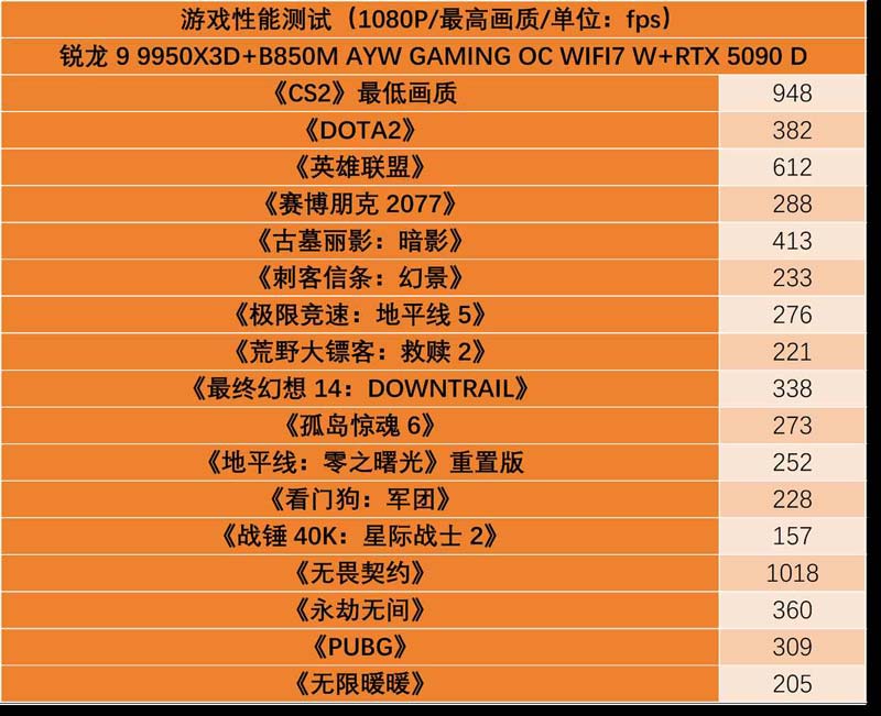 在大家最关心的游戏性能方面,我们选择了十几款热门游戏进行测试。综合游戏的帧率表现来看,该主板搭配amd锐龙9 9950x3d+rtx 5090d游戏平台的表现同样出色,1080p最高画质下,在《无畏契约》这种fps游戏中更是可以达成千帧水平,而在3a游戏大作中的帧率也非常流畅,充分发挥了处理器和显卡的性能,可以为玩家带来优秀的游戏体验。