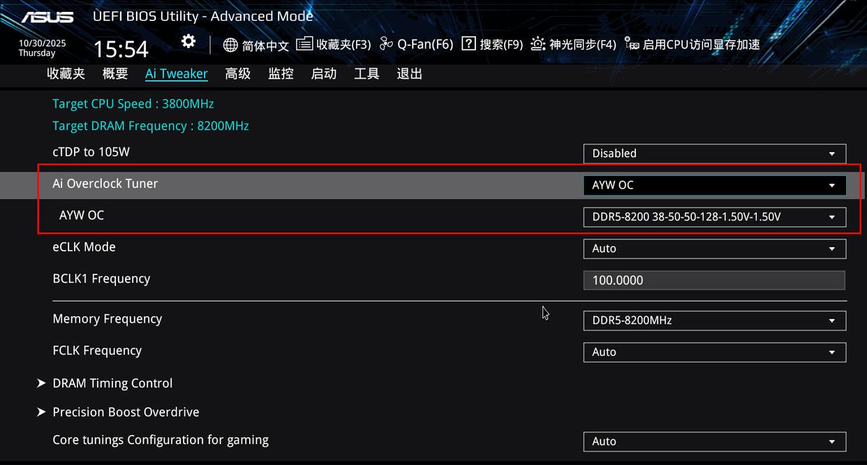 针对新手玩家,这块主板还支持ayw oc profile一键超能模式。可在bios内一键开启ayw oc profile,提升内存的性能表现。我们在实测中,使用云彣ddr5 8000内存,开启ayw oc profile一键超能模式后可以让内存自动超频至8200mt/s。