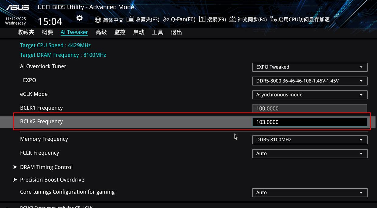 除此之外,该主板还内置了异步时钟发生器,能够单独对处理器的外频进行调节,这也是它的一大亮点。在ai overclock tuner开启manusl选项后,我们可以在eclk mode(外频模式)中选择同步或者异步,选择asynchronous异步模式后多出的bclk 2选项,就可以单独对处理器的外频进行调节了。