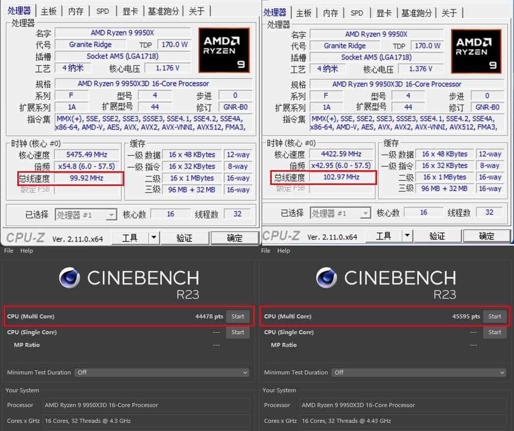 我们使用锐龙9 9950x3d进行测试,将外频增加了3mhz,cinebench r23多线程得分从44478提升到45595,有了2.5%的提升。除此之外,对处理器外频的调整,也会给内存、sssd的性能带来额外收益。可以看到,超外频后,内存的读写性能和延迟表现都得到了进一步提升,更能发挥平台的极限性能,