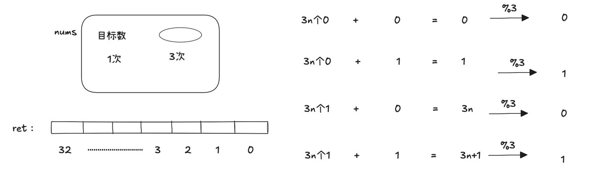 除目标数外,每一个数的二进制的每一位要么为0要么为1,则所有数的对应的二进制位数相加,应该为3n个0或者3n个1(n表示整数),将其与目标数的对应二进制位相加后%3: