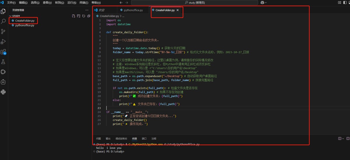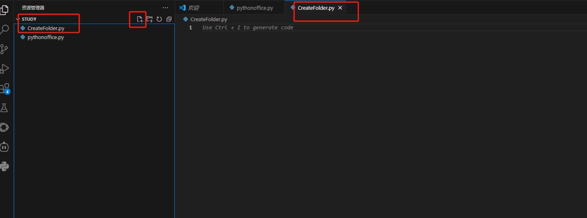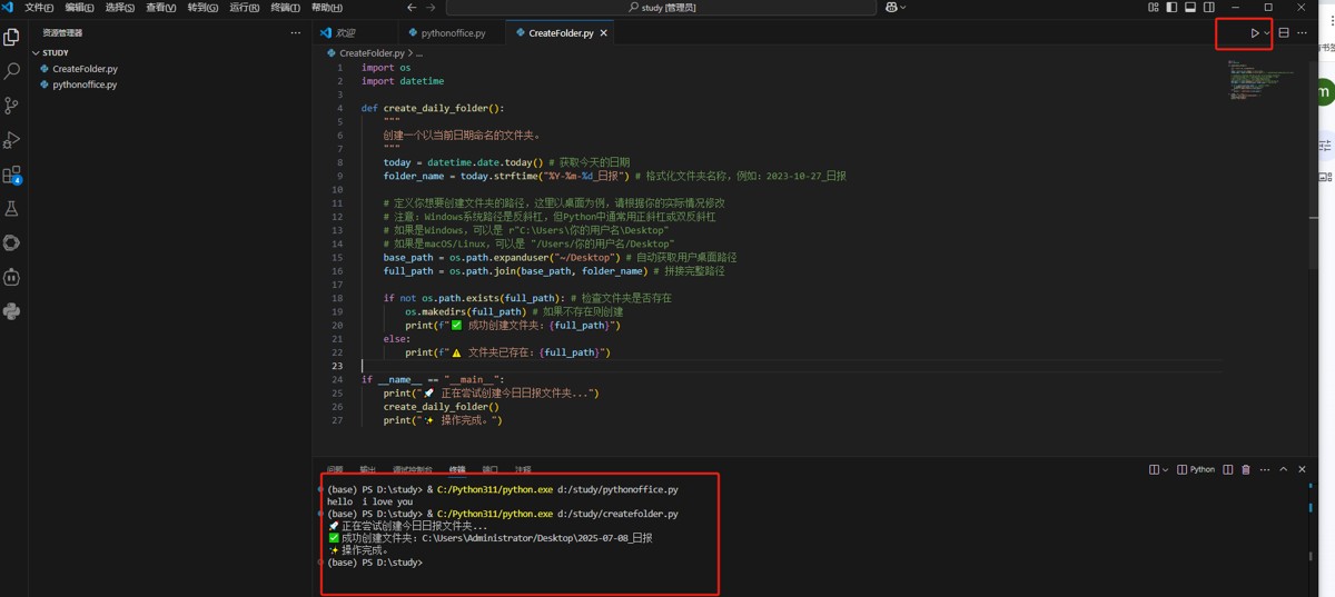 复制粘贴: 可以在建立一个文件,和之间建立pythonoffice一样,我们起个名字 createfolder.py。