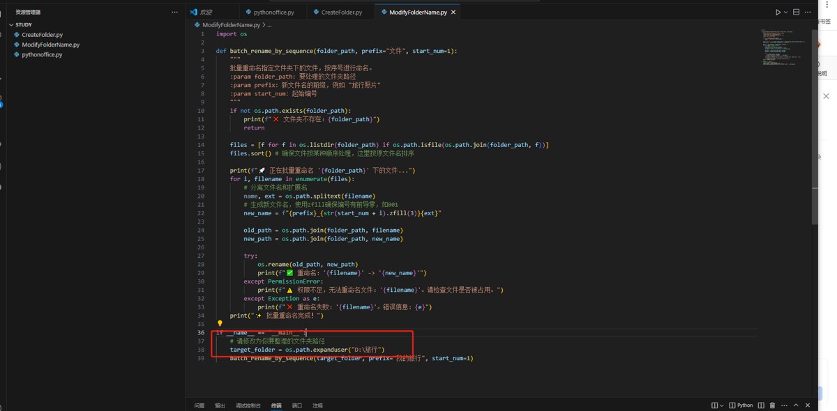 复制粘贴: 可以在建立一个文件,和之间建立pythonoffice一样,我们起个名字 modifyfoldername.py,将上面代码进行粘贴。