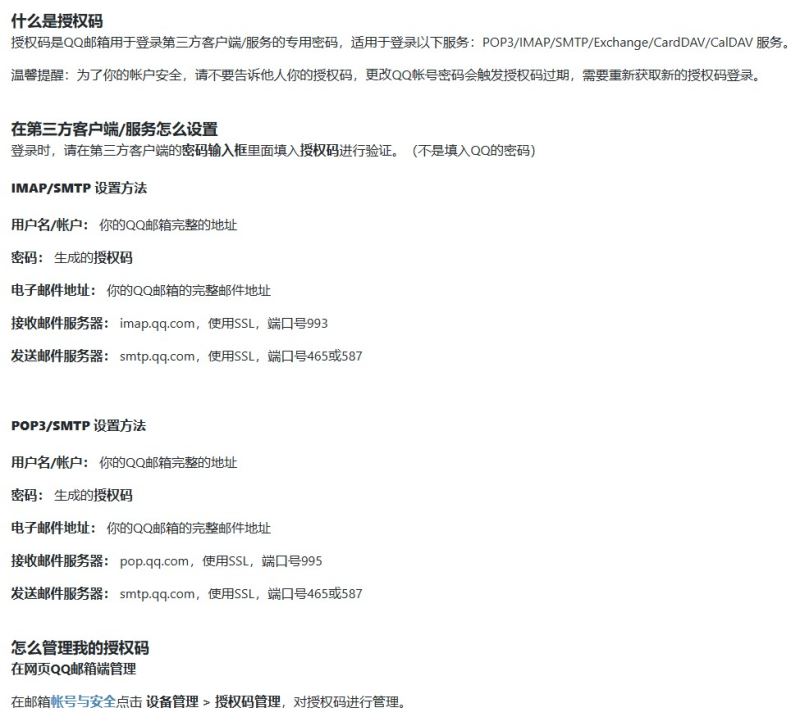 | qq邮箱 | smtp.qq.com | 465(ssl)/587(tls) | 需要开启smtp服务并获取授权码 |