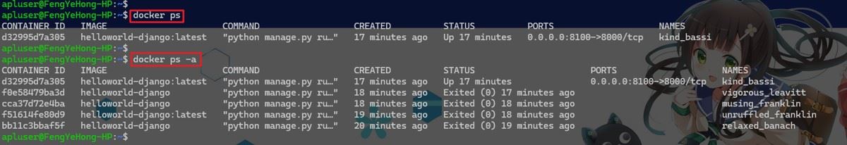 apluser@fengyehong-hp:~$ docker container ls container id image command created status ports names 783e1ad29407 helloworld-django:latest "python manage.py ru…" 16 minutes ago up 16 minutes 0.0.0.0:8100->8000/tcp reverent_lalande apluser@fengyehong-hp:~$ apluser@fengyehong-hp:~$ docker container stop 783e1ad29407 783e1ad29407