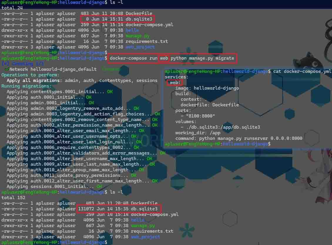 apluser@fengyehong-hp:helloworld-django$ ls -l total 148 -rw-r--r-- 1 apluser apluser 483 jun 11 20:48 dockerfile -rw-r--r-- 1 apluser apluser 131072 jun 7 16:56 db.sqlite3 drwxr-xr-x 4 apluser apluser 4096 jun 7 09:38 hello -rwxr-xr-x 1 apluser apluser 667 jun 7 09:38 manage.py -rw-r--r-- 1 apluser apluser 16 jun 7 09:38 requirements.txt drwxr-xr-x 3 apluser apluser 4096 jun 7 09:38 web_project