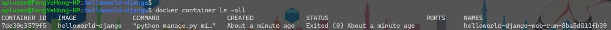 apluser@fengyehong-hp:~$ docker container ls container id image command created status ports names 783e1ad29407 helloworld-django:latest "python manage.py ru…" 12 seconds ago up 11 seconds 0.0.0.0:8100->8000/tcp reverent_lalande apluser@fengyehong-hp:~$ apluser@fengyehong-hp:~$ docker exec -it 783e1ad29407 bash root@783e1ad29407:/app# ls -l total 20 -rw-r--r-- 1 root root 483 jun 11 11:48 dockerfile -rw-r--r-- 1 root root 0 jun 13 23:58 db.sqlite3 drwxr-xr-x 4 root root 4096 jun 7 00:38 hello -rwxr-xr-x 1 root root 667 jun 7 00:38 manage.py -rw-r--r-- 1 root root 16 jun 7 00:38 requirements.txt drwxr-xr-x 3 root root 4096 jun 7 00:38 web_project