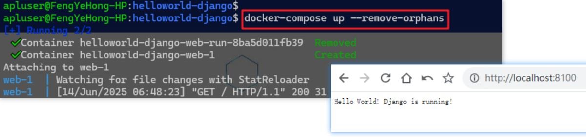 -it:容器的 shell 映射到当前的 shell,然后你在本机窗口输入的命令,就会传入容器--rm:容器一旦停止就会自动删除(仅在临时测试时使用)-p:容器的 8000 端口映射到本机的 8100 端口helloworld-django:latest:指定要启动的容器