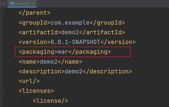 先让idea知道你这次要打包成war包,在pom.xml中设置打包方式 默认为jar 需要修改为war