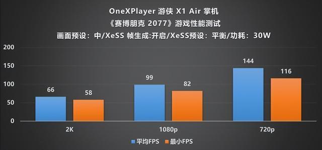 我们以xess预设平衡模式为基础,打开xess 2帧生成模式对x1 air掌机进行了全面测试。数据表明,在15w的低功耗下,在2k分辨率下已经达到44帧,这种状态玩起来已相当流畅,接着将帧率下放到1080p,这时候的平均帧率已然突破了60帧的流畅水准,高达65帧,做到流畅游玩应该没有太大的压力。最后将帧率再次下降至720p,帧率也不出意料地提升至100帧,玩家的游玩体验将会变得更加丝滑,而且最小fps也有大约39帧,这算是相当不错的水平了,能够维持在35帧以上,说明即使是最低帧率,玩家能够感受到的帧率波动也是微乎其微。