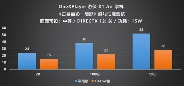 为了保证测试数据的准确性,我们统一将画质预设更改为middle、关闭垂直同步以及锁帧功能。在多轮测试后,游侠x1 air的性能表现都可谓是相当强悍。在15w的低功耗下,无论是2k还是1080p均突破了30帧,且以高达40%的增幅稳步提升,2k分辨率能够稳定在33帧,来到1080p时又增加了20帧,达到了53帧。无论如何,玩家都能够轻松畅玩这款jrpg神作。