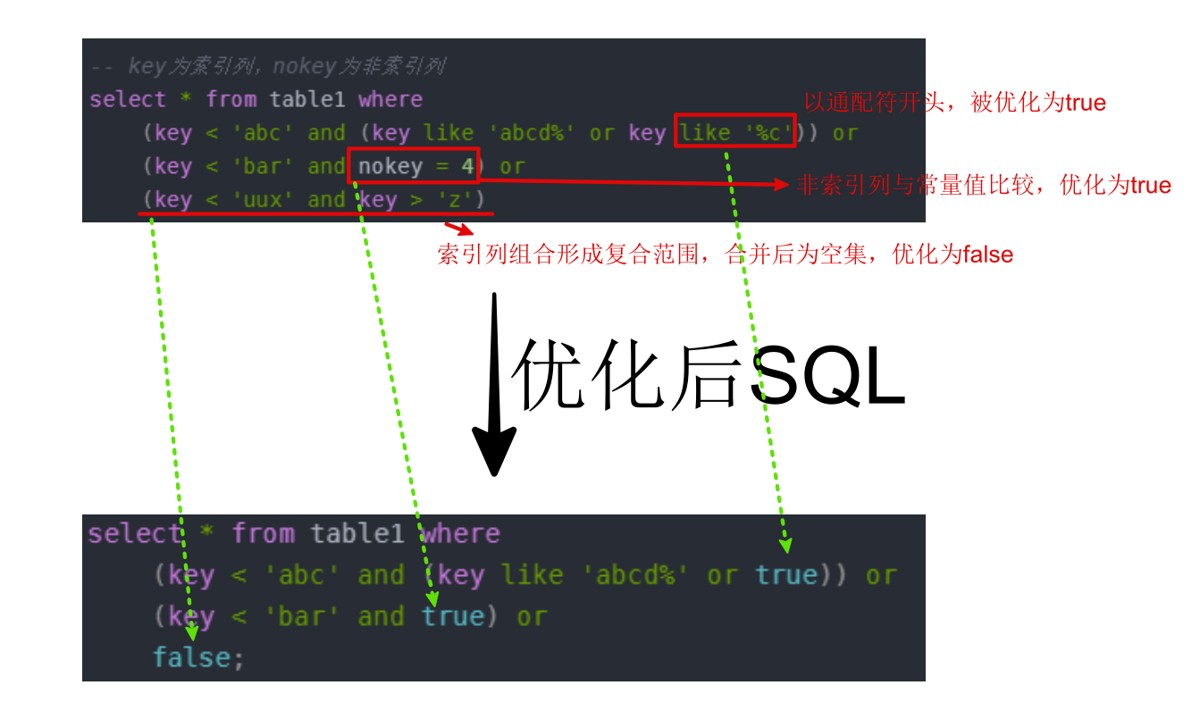 select * from table1 where (key < 'abc' and (key like 'abcd%' or true)) or (key < 'bar' and true) or false; -- 化简 -- 1.(key like 'abcd%' or true)始终为true select * from table1 where (key < 'abc' and true) or (key < 'bar' and true) -- 2.合并范围 select * from table1 where key < 'bar'