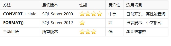 2. 使用 format() 函数(sql server 2012+,灵活但性能低)
