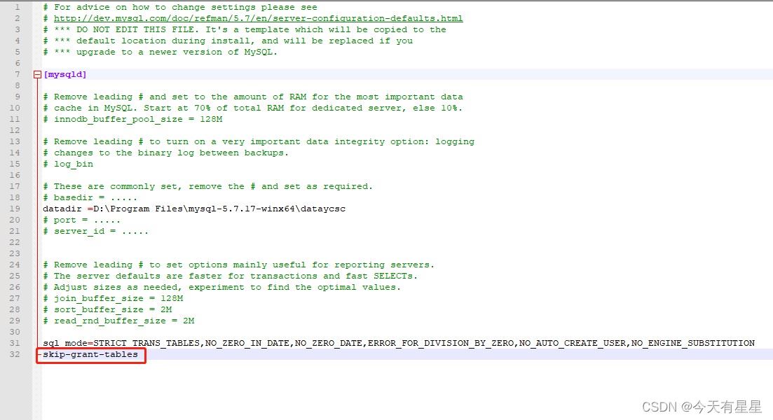 打开my.ini文件后拉到最下边添加一行代码skip-grant-tables,添加后保存文件,重启mysql服务,首次登录跳过密码验证即可生效。