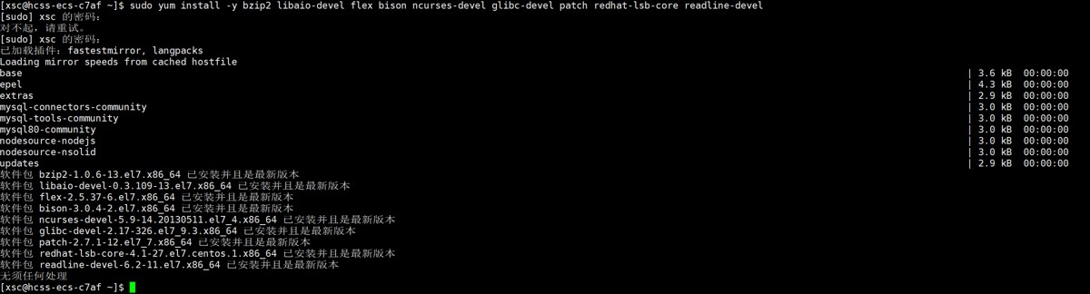sudo yum install -y bzip2 libaio-devel flex bison ncurses-devel glibc-devel patch redhat-lsb-core readline-devel