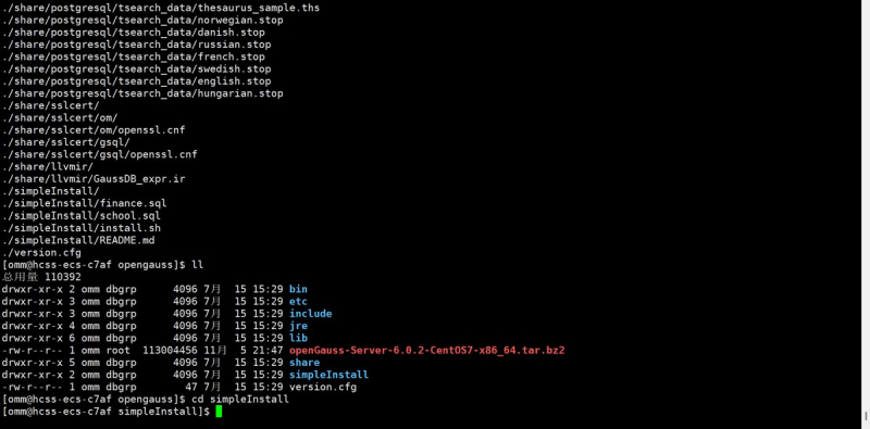 cd /opt/opengauss # 解压(注意后缀是 .tar.bz2,用 -j 参数) tar -jxvf opengauss-server-6.0.2-centos7-x86_64.tar.bz2 # 解压后会生成 `simpleinstall` 目录,进入该目录 cd simpleinstall