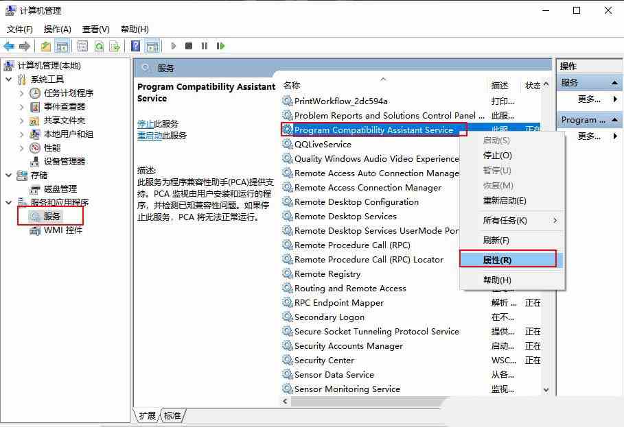 2、计算机管理窗口中,点击展开左侧的服务和应用程序下的服务,再在右侧窗口中找到 program compatibility assistant service 这项服务,在该服务名称上点击右键,在打开的菜单项中,选择属性;