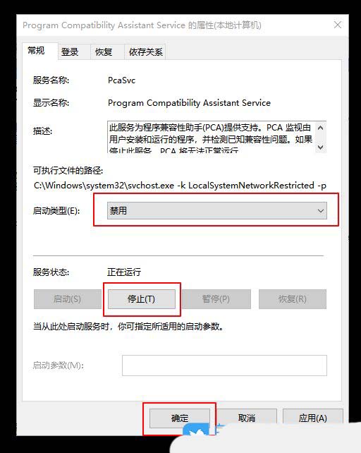 4、program compatibility assistant service窗口,将启动类型修改为禁用,并点击停止;