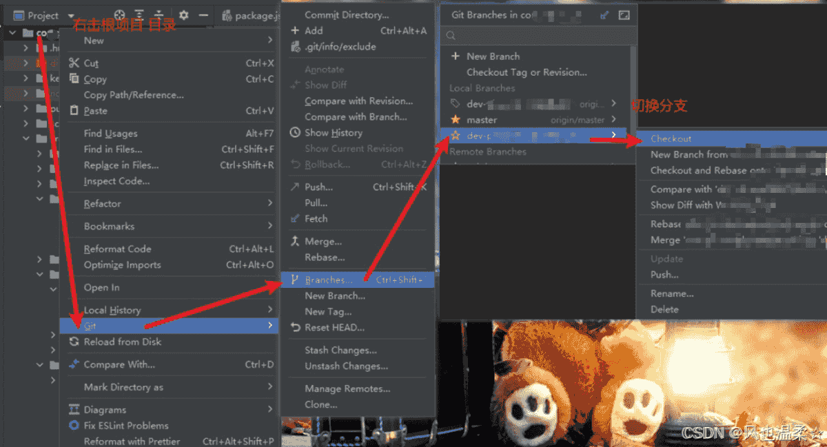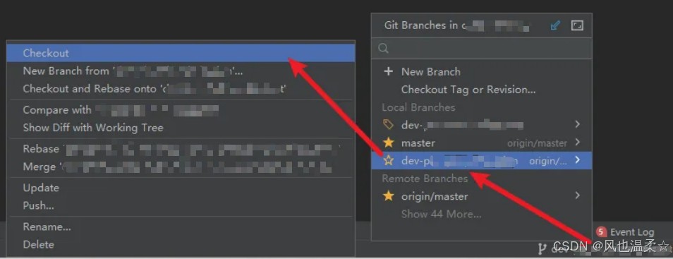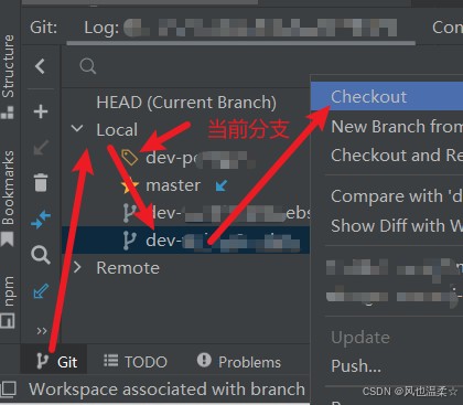 idea/webstorm编译器 右下角状态栏 -> 点击当前分支 -> 选择要切换的分支 -> checkout