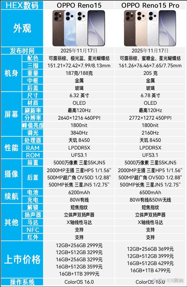 时隔半年左右时间,oppo reno系列又推出新机。接下来,hex数码就带大家来了解reno 15系列。一起看看标准版和pro版二者在参数上有什么吧。