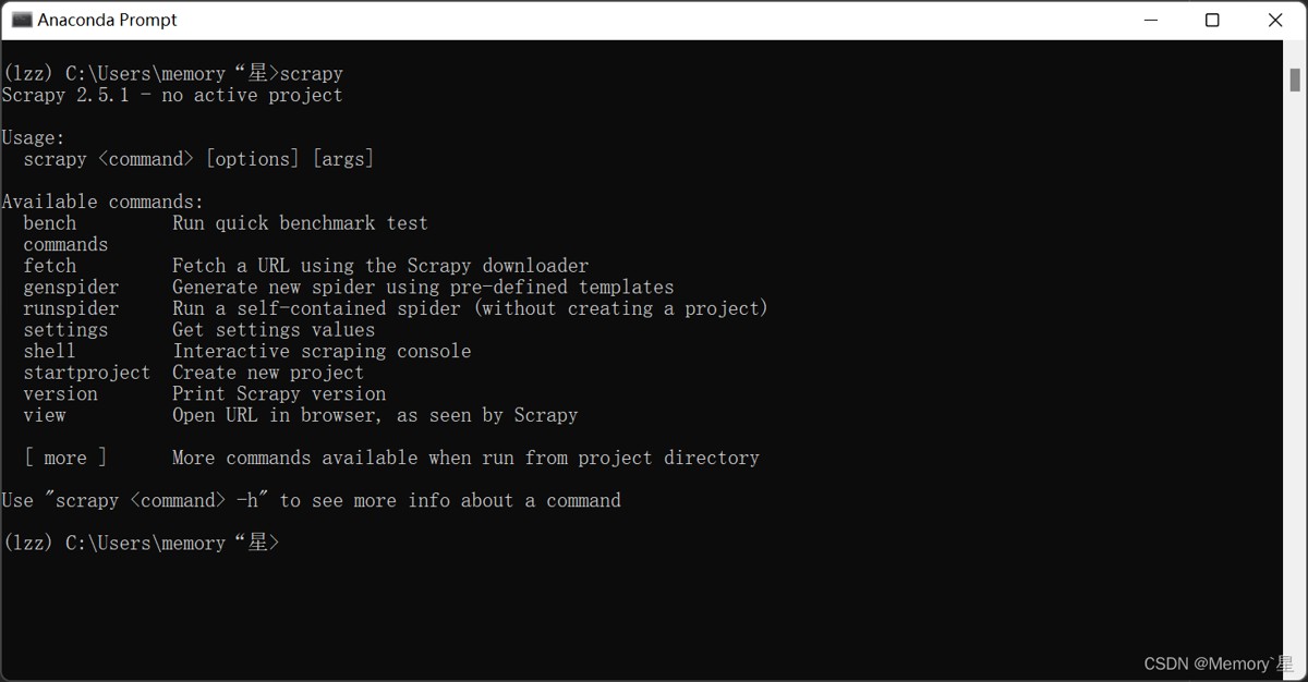 在终端里输入scrapy即可验证是否安装成功,以下是没有安装前的情况。