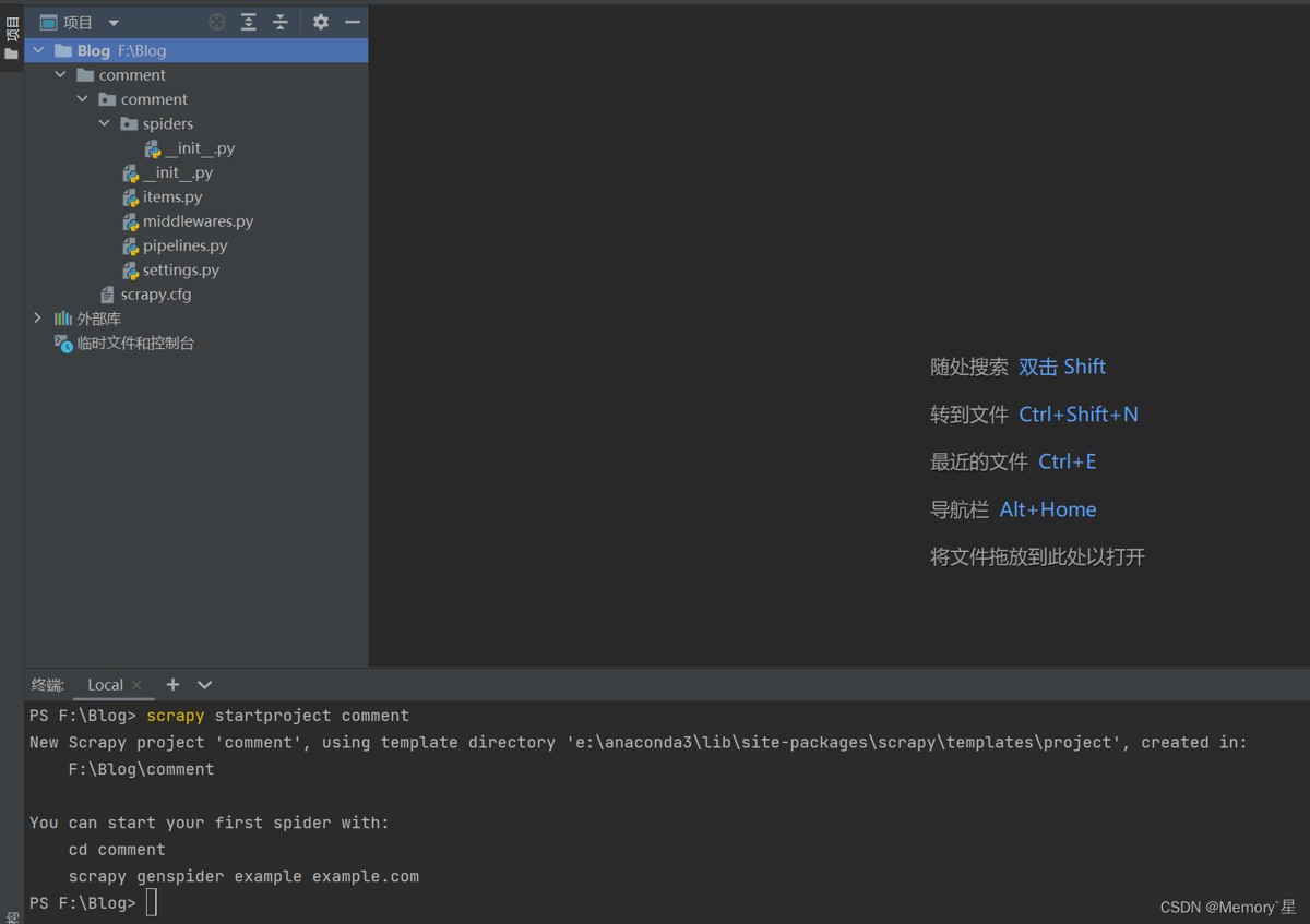 scrapy startproject comment(comment为你的工程名称)