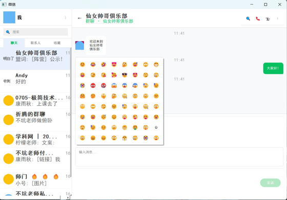 本文介绍了一个基于pyqt5的微信界面克隆实现。该程序创建了一个包含侧边栏和聊天区域的主窗口,模拟了微信的基本ui元素和交互功能。侧边栏包含用户信息、搜索框、功能按钮和聊天列表,聊天区域则实现了消息显示和输入功能。程序支持发送文本消息、表情符号和文件,并模拟了自动回复功能。界面设计遵循微信风格,包括圆形头像、气泡消息框和绿色主题色。该实现展示了如何使用pyqt5构建复杂的gui应用程序,涵盖了布局管理、样式定制、事件处理和组件交互等关键技术。