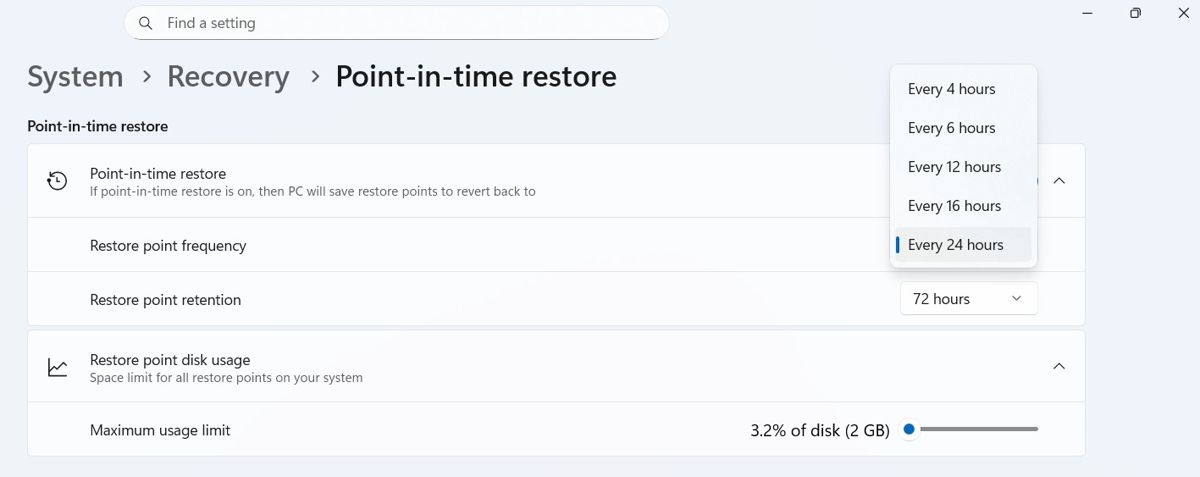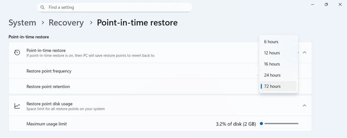 功能开启后,用户可以自定义还原点的创建频率(4 至 24 小时)和保留时长(6 至 72 小时)。值得注意的是,微软设定了一个硬件门槛:只有当电脑总磁盘空间不小于 200gb 时,该功能才会被默认开启。
