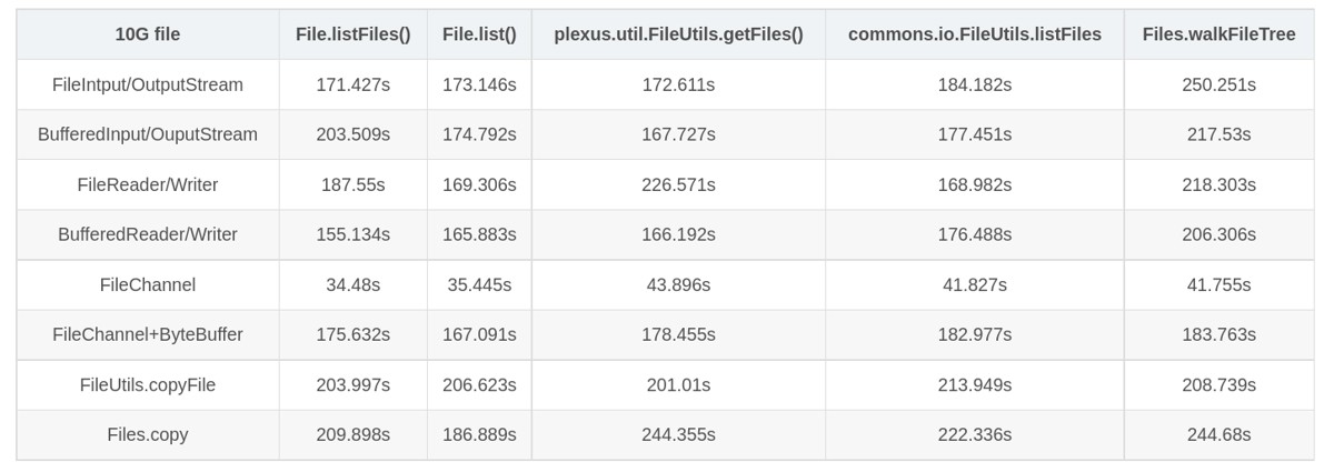 所以呢,看看各种方法效率怎么样,主要衡量的标准就是时间,另外的一些标准包括大文件的复制时的内存溢出等问题。