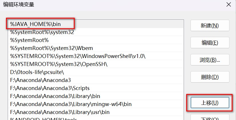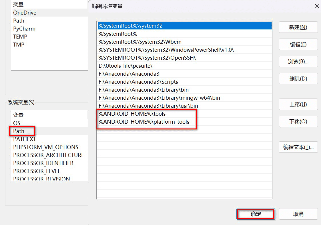 - 点击path,添加以下内容,并上移至顶端以避免其他环境冲突