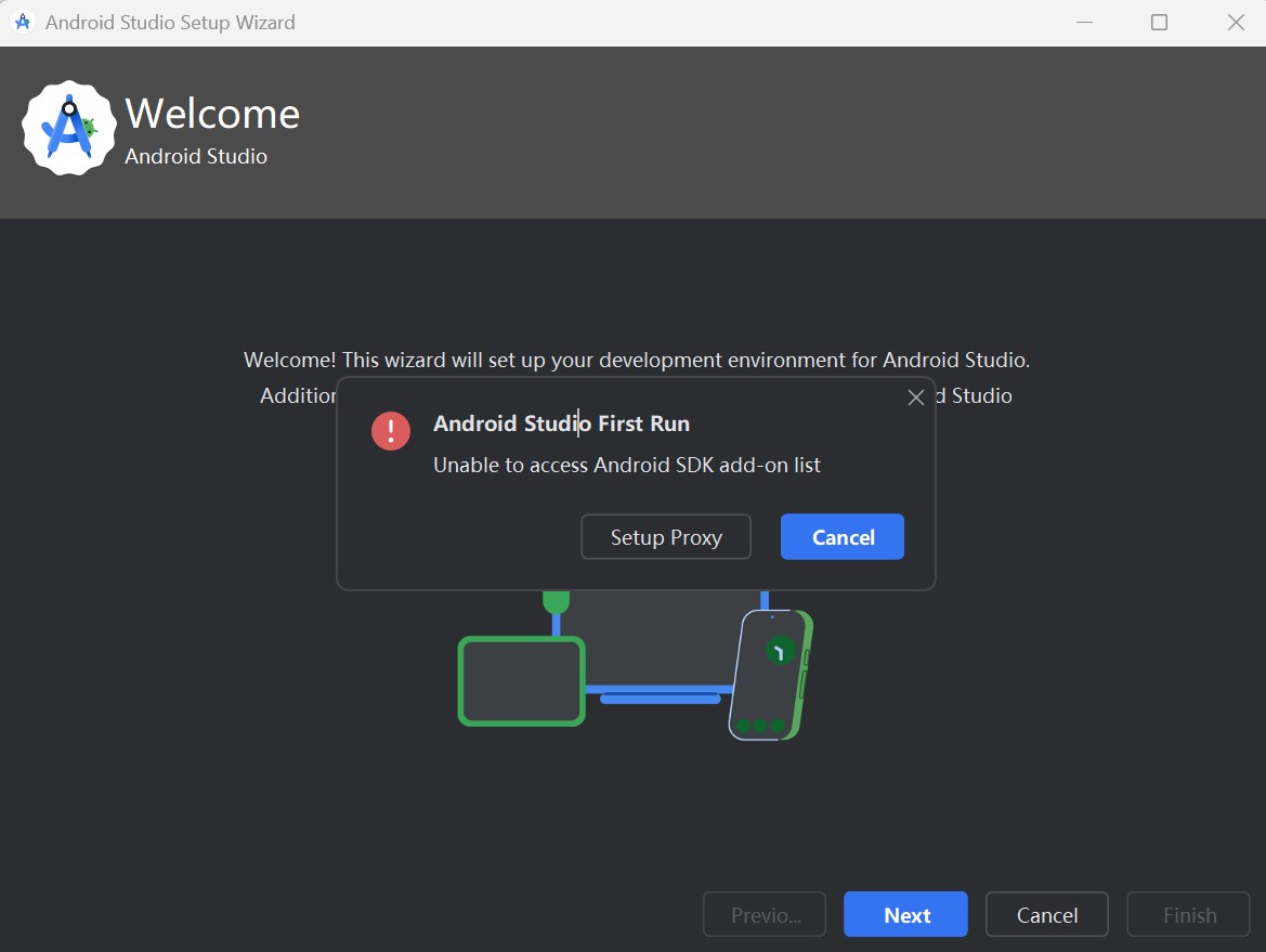 这里意味着android studio无法连接到google的服务器来获取可用的sdk组件列表,不用管,点击 cancel