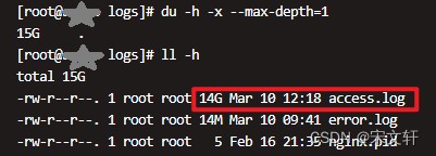 就可以看到当前目录下access.log文件为14g,其实这个文件一般情况下是没有太大作用的,既然这样,那我们就可以针对性的去解决它。