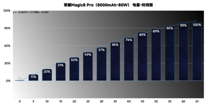 在充电方面,荣耀500 pro最高支持80w有线快充与50w无线快充。根据天极网实测,30分钟可充入57%,完整充满约需61分钟,具体充电速度表现如下: