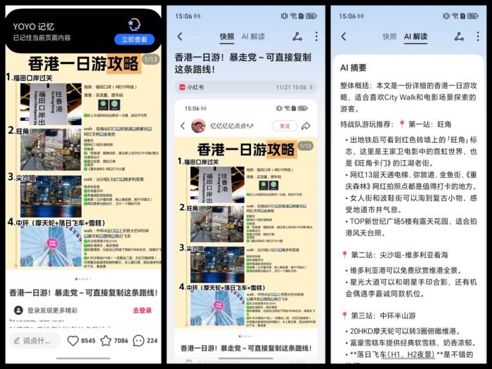 “yoyo 记忆”功能支持三指下滑或直接唤醒yoyo,即可对当前屏幕内容进行智能梳理。不论是页面中的多组数据信息,还是小红书里的旅游攻略,系统都能自动提取关键信息并进行结构化整理。整理后的内容会被保存在yoyo记忆中,后续用户只需开口询问即可随时调取,使用起来更加便捷高效。