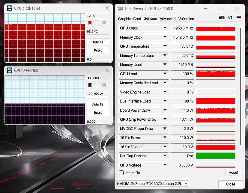 为了模拟玩家实际使用的情况,我们在rog魔霸9 mini预装的奥创工具中选择了增强模式进行常规测试。按照官方规格,此模式下总性能释放为240w(cpu 130w + gpu 110w),cpu单考满载130w,gpu单考满载115w,风扇转速按模式策略自动控制。在这个模式下进行双考,cpu持续满载功率约130w,显卡整板满载功率大约115w,性能释放其实已经略高于官方标准。同时,我们可以看到在如此迷你的机身内,rog魔霸9 mini把考机温度也控制得比较好,可见其散热设计也是非常优秀的。