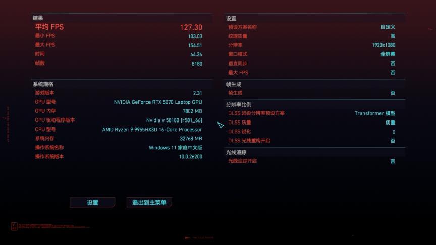 在《赛博朋克2077》中,我们仅需开启dlss质量模式,rog魔霸9 mini就可以在最高画质下实现127.3fps的平均帧率,流畅度和操控响应速度都表现出色。这种3a大作,rog魔霸9 mini确实可以轻松拿捏。
