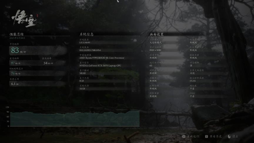 《黑神话:悟空》在最高画质设定下对电脑的硬件要求还是很高的,我们开启dlss(数值设定为65)和帧生成之后,rog魔霸9 mini可以让它跑出83fps的平均帧率,流畅度还是不错的,在这样的设定下,画质和流畅度都得到了可靠的保障。