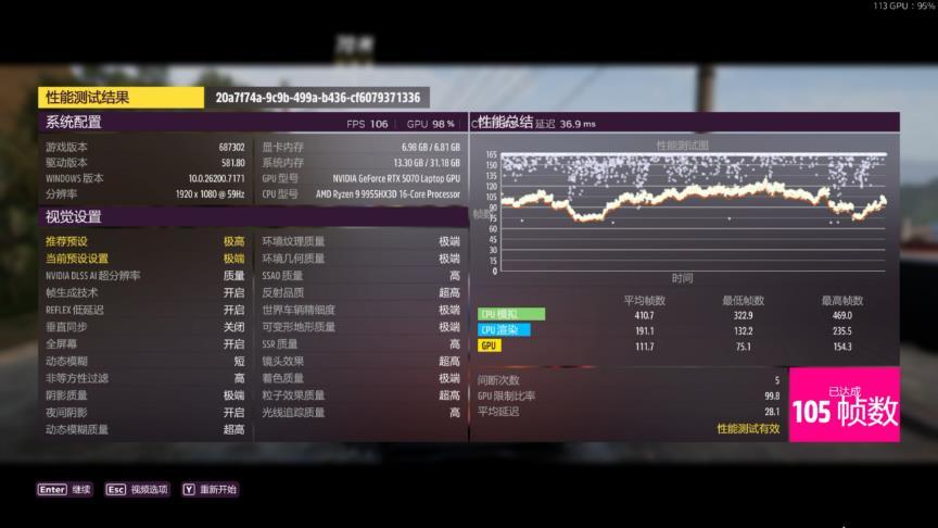《极限竞速:地平线5》在极限画质设定下,开启dlss质量模式和帧生成,可以在提供最佳视觉效果的同时提供超过100fps的帧率,对于赛车游戏来说,游戏体验是相当不错的。
