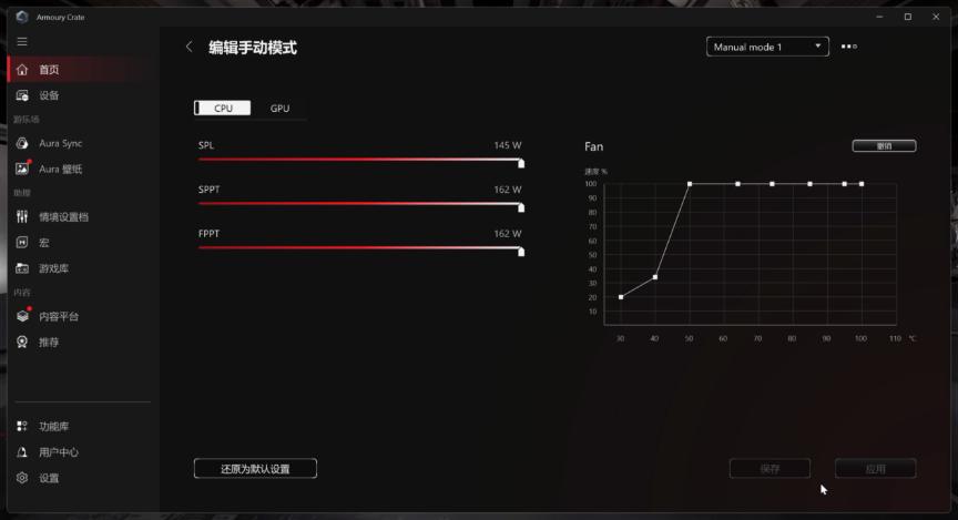 ▲在“手动模式”中将cpu持续满载功率和瞬时功率分别提升到145w和162w上限,并调高风扇转速