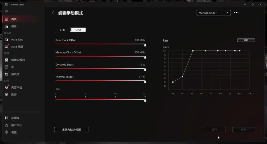 ▲在“手动模式”中将gpu动态加速功率、tgp整板功率、gpu和显存频率都提升到上限,并调高风扇转速