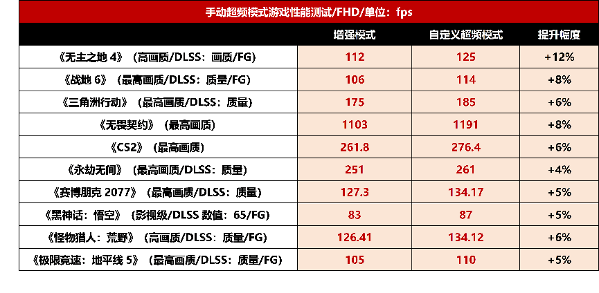 前面我们介绍过,rog魔霸9 mini在奥创设置中除了预设的“windows”、“静音”、“性能”、“增强”模式外,还提供了“手动”模式,在这里可以进一步拉高cpu和gpu的性能限制并提供显卡超频功能。这里我们就直接在手动模式里把每一项都拉到上限,看看能带来多少性能提升。从实测来看,手动拉满的模式下,rog魔霸9 mini在各款游戏中能实现4%~12%的帧率提升,平均提升幅度可达6.5%左右。对于不喜欢研究超频的玩家,也可以通过这样的方式来快捷地获得免费的性能提升。