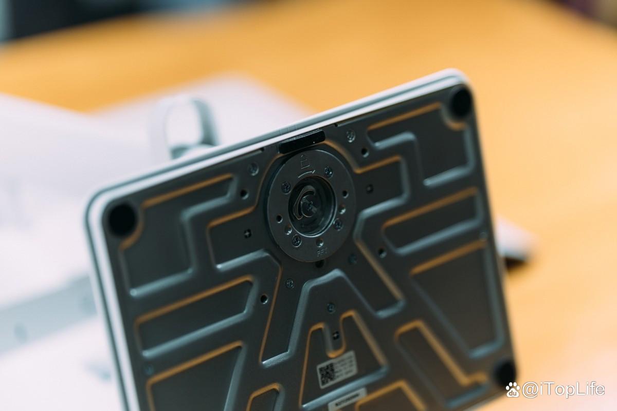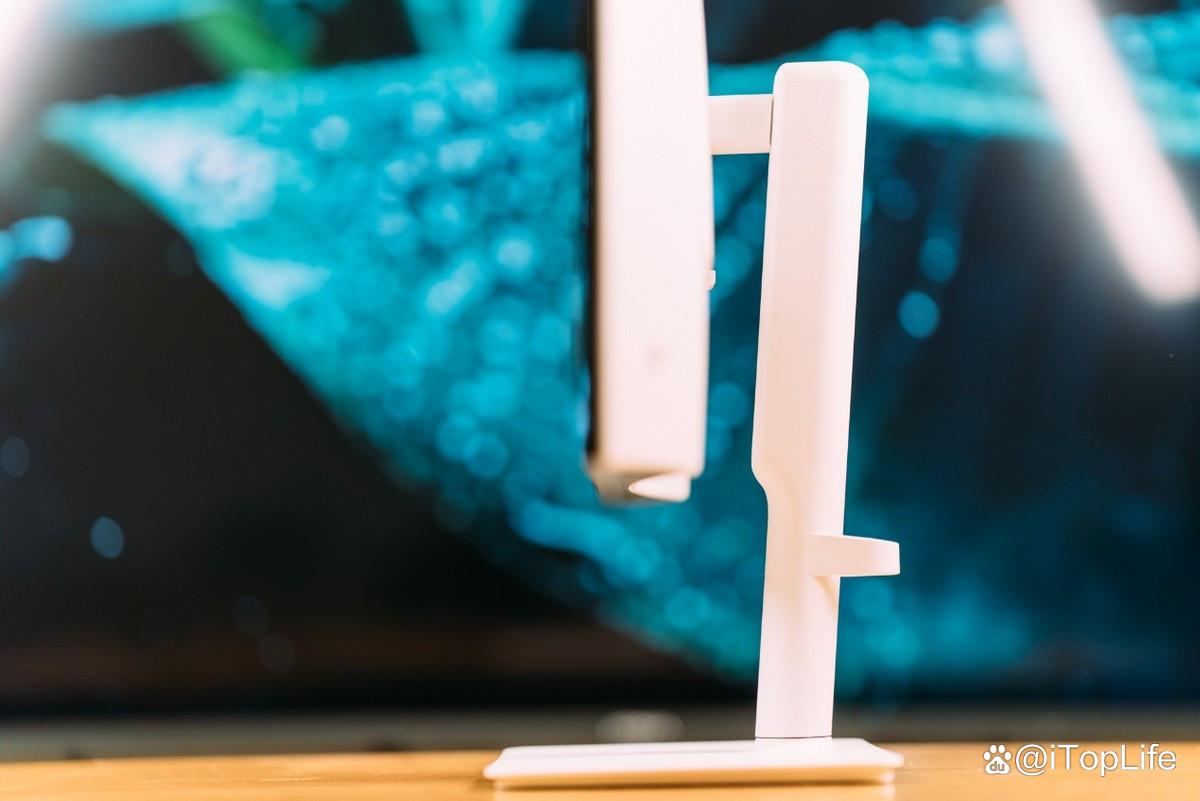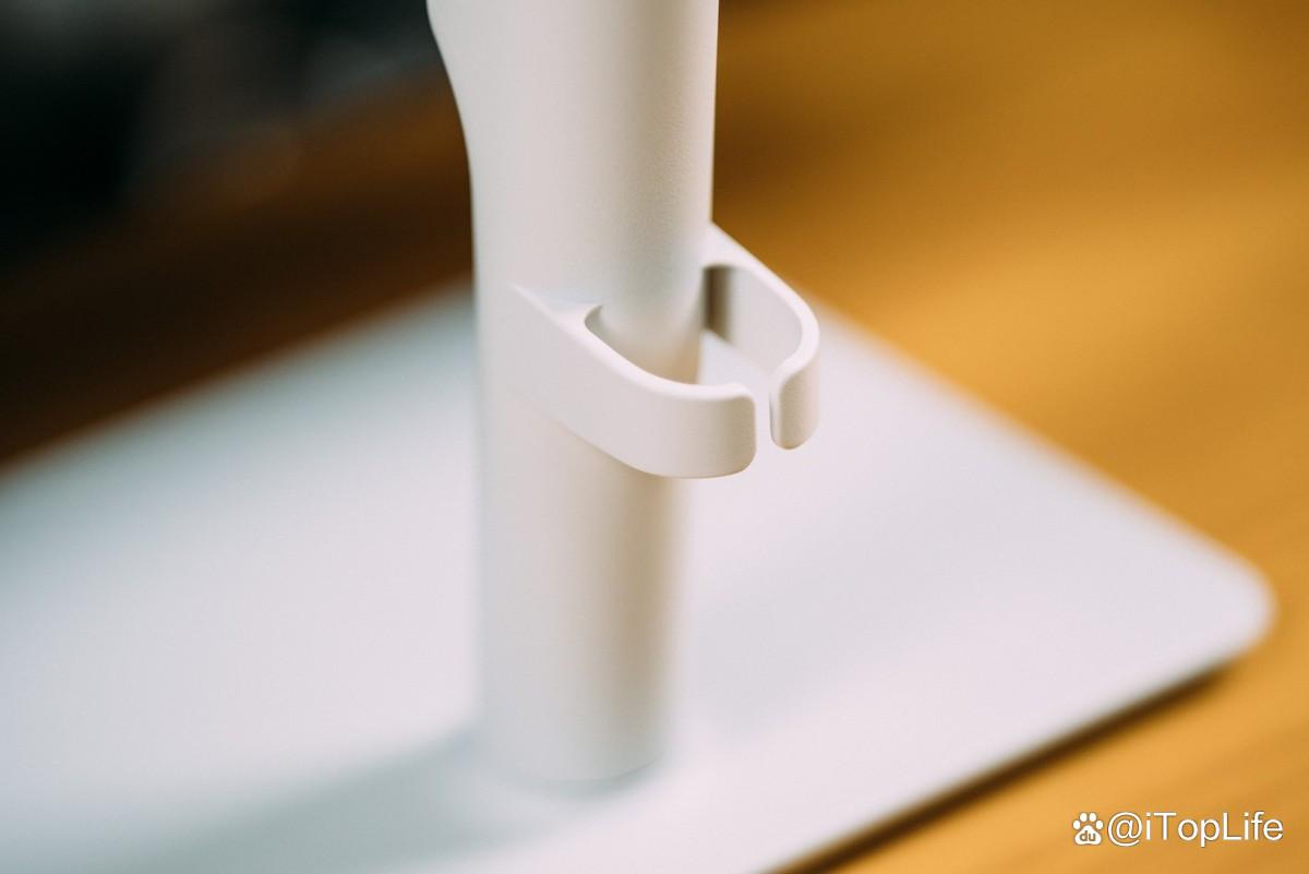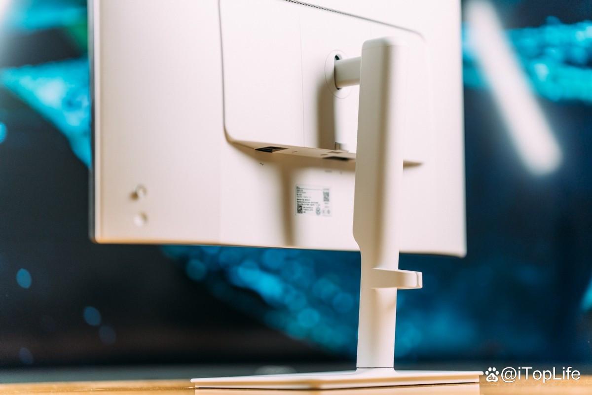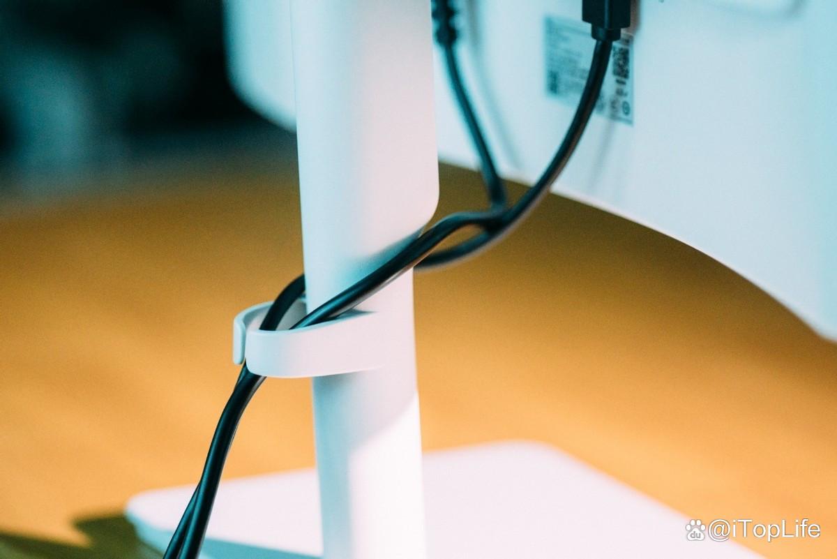 支架背部设置了束线设计,但没有挖孔,意味着显示器电源和视频输入都需要从支架外侧走线。