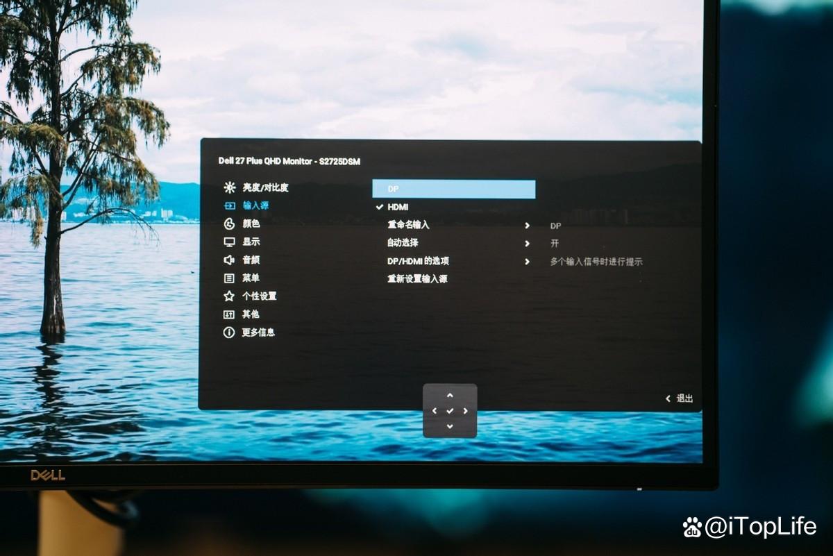 而调节音量、屏幕设置、信号源切换等功能都是通过显示器背后的五维导航键完成的。事实上戴尔s2725dsm显示器的按钮只有两个,一个电源键和一个五维导航,上手非常简单。即使隔着屏幕也能轻松操作。