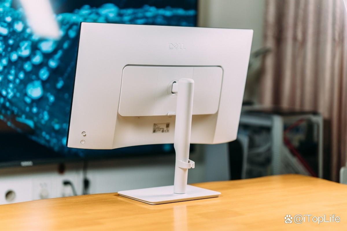 从整体来看,显示器外观简洁大方,背后除了dell logo和必要的散热设计之外,不做过多的设计。同时圆润弧度配合白色外观,给显示器带来外观带来不错的亲和感,也确保显示器能够很好的融入居家环境中。